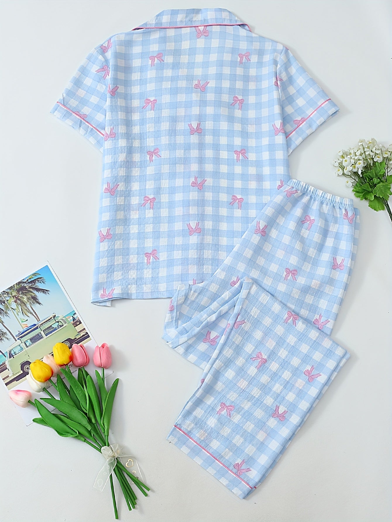 [2-Piece Plaid Pajama Set] Women's Two-Piece Pajama Set | Short-Sleeve Button-Up Shirt & Long Pants | Plaid Bow Print | Spring, Summer, Autumn Casual Home Wear
