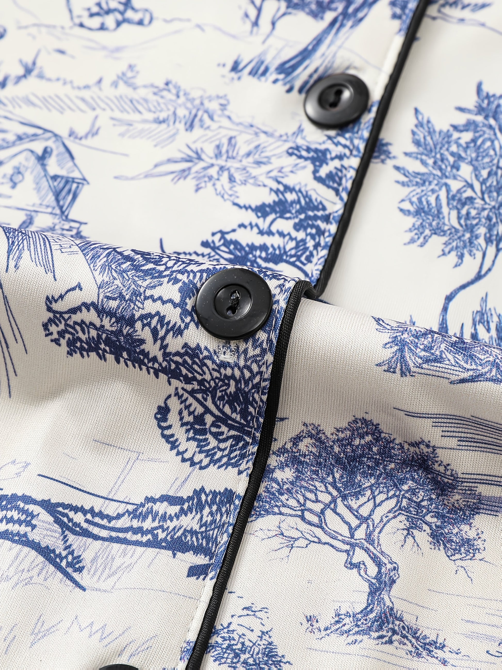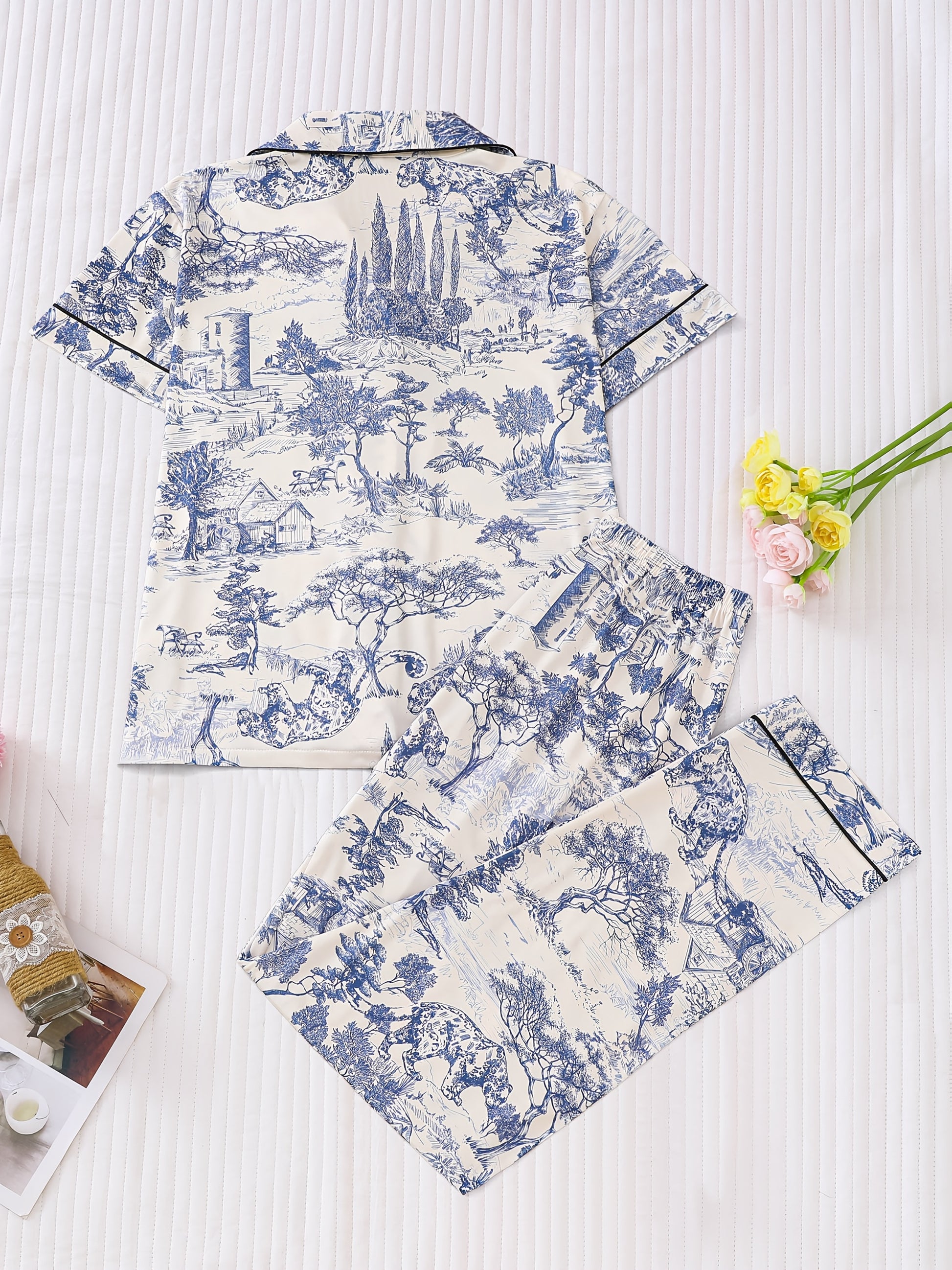 Elegant Women's Sleepwear Set In Two Pieces, Featuring Full Body Printed Patterns, Knitted Fabric, Long Sleeved Button Up Top, Paired with Long Pants for Comfortable Wearing, Collar And Pocket Details, Suitable for Women's Adult Sleepwear Set