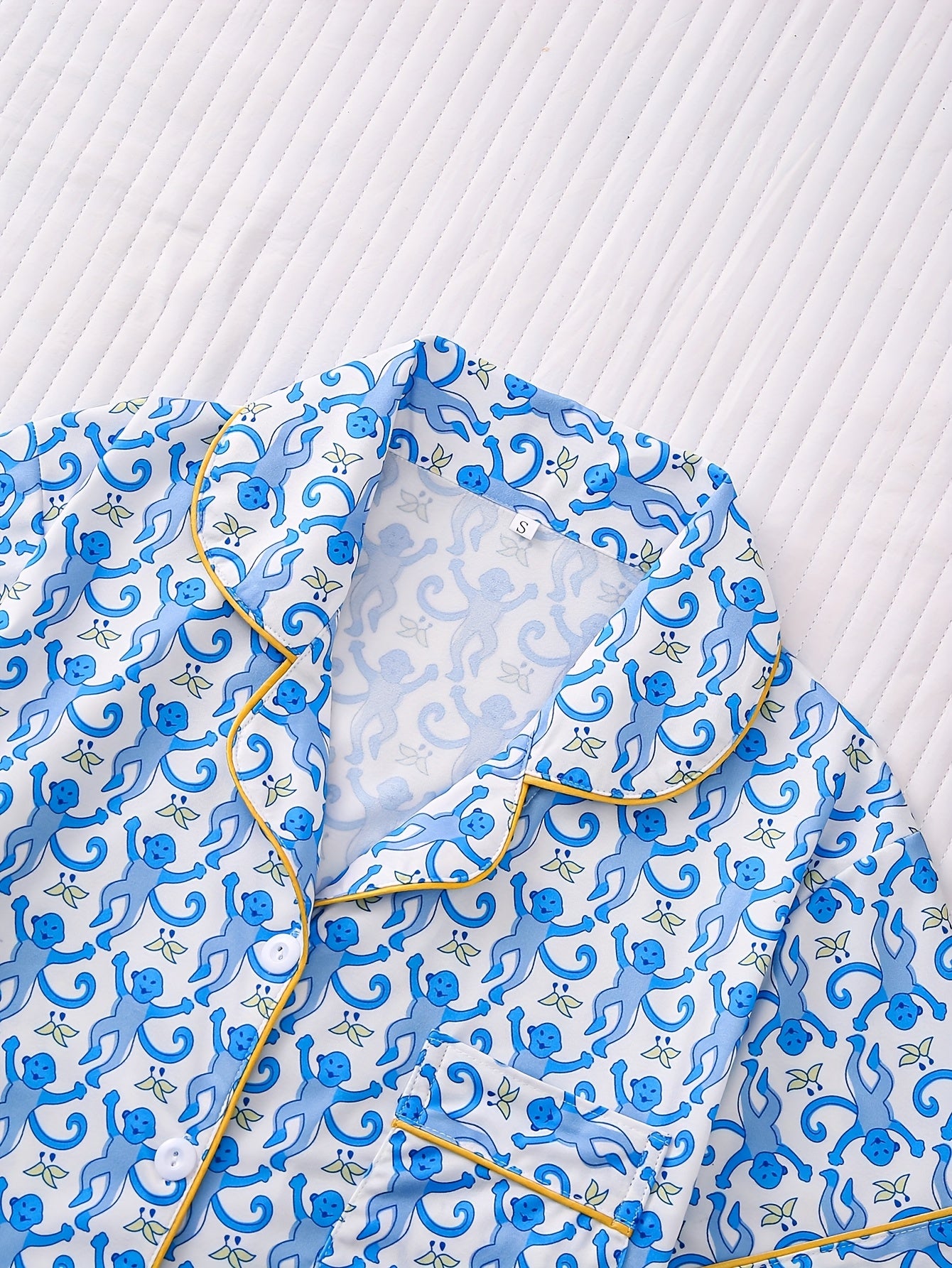 Three Sets Of Women'S Pajamas Set, Women'S Pajamas Set Combination, Knitted Fabric, Short Sleeved Button Top And Matching Pants, Full Body Print, Collar And Pocket Details, Suitable For ' Adult Pajamas Set