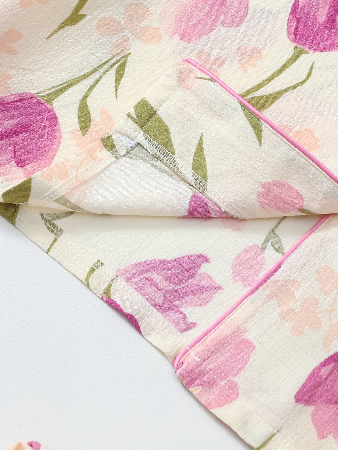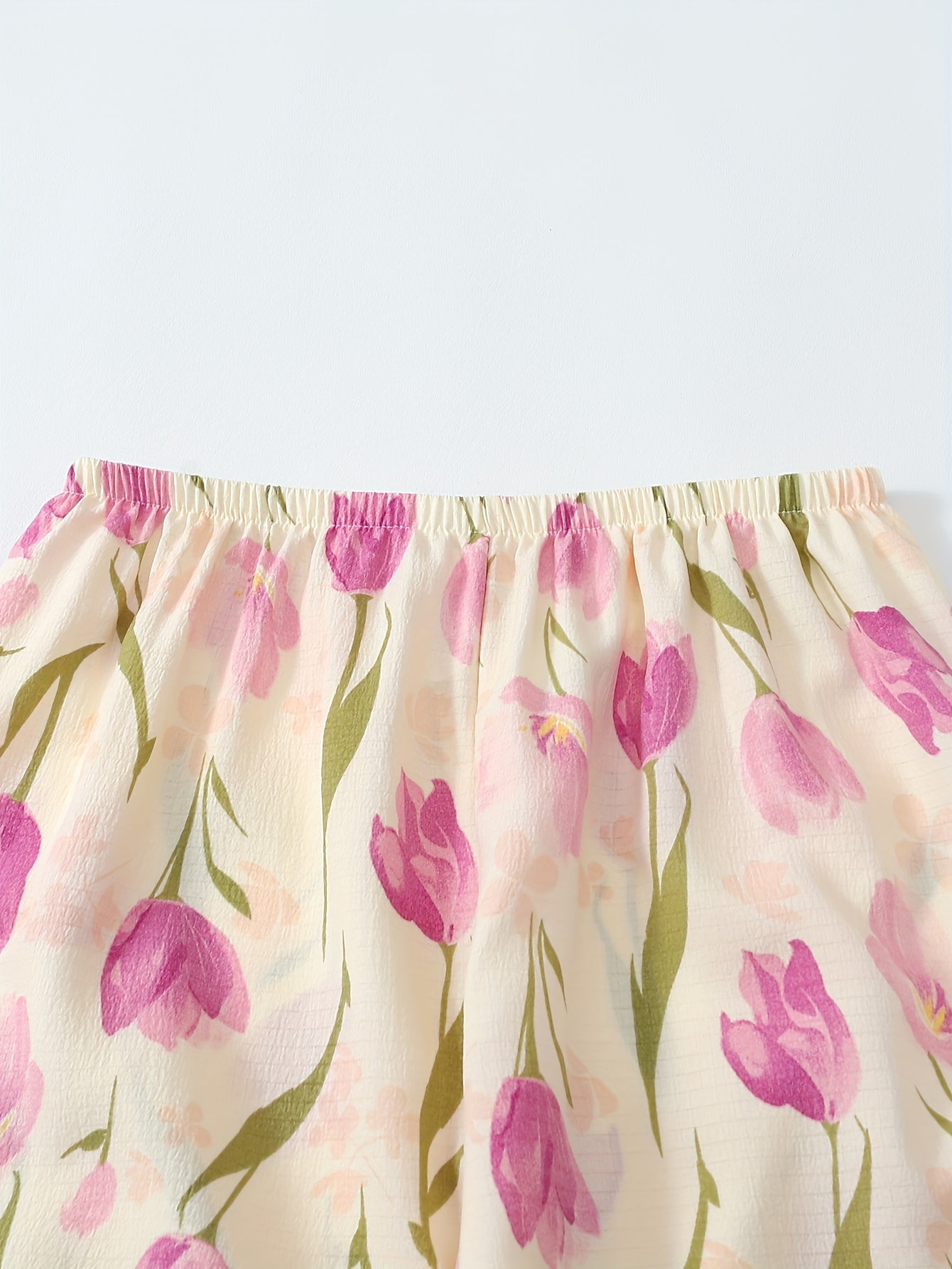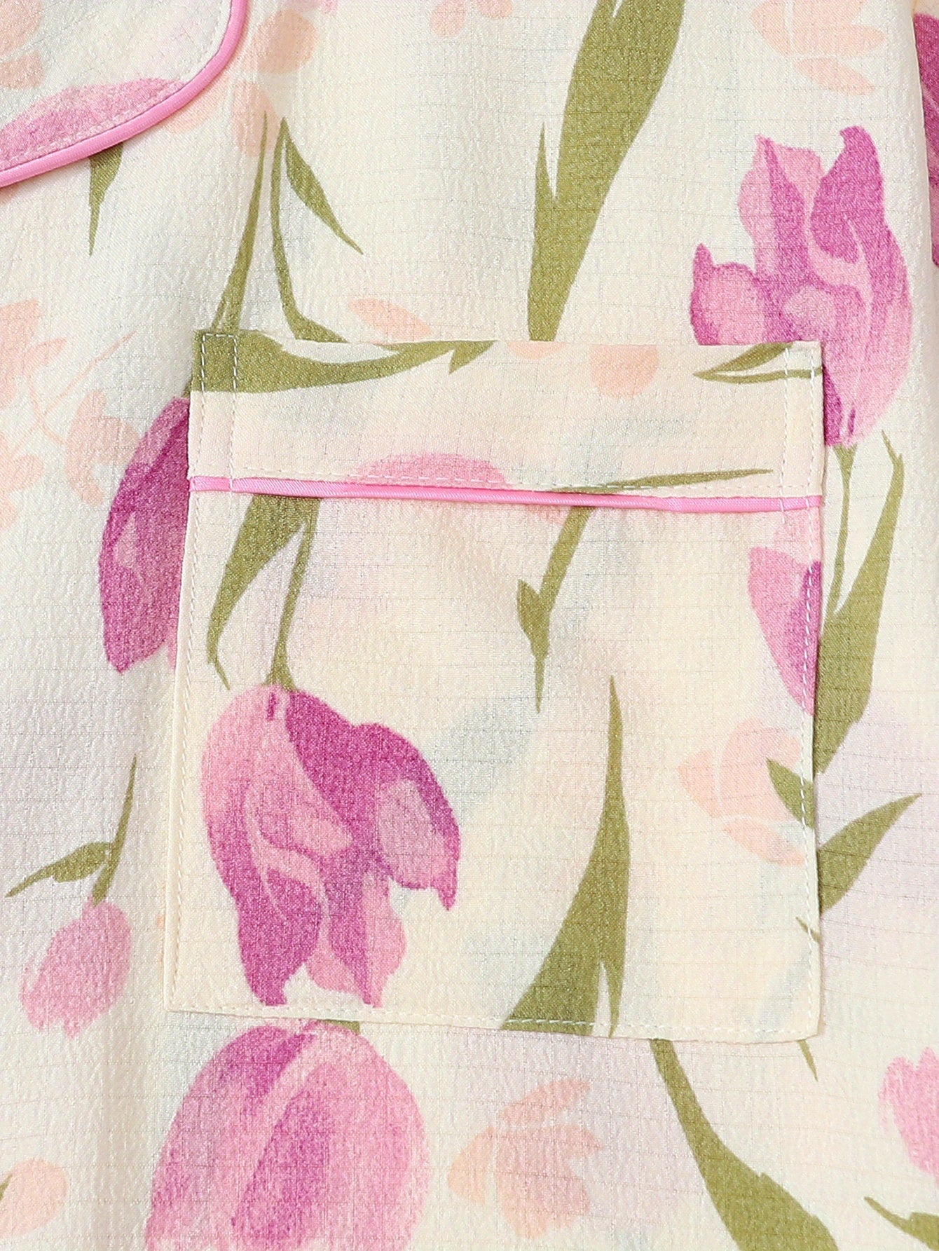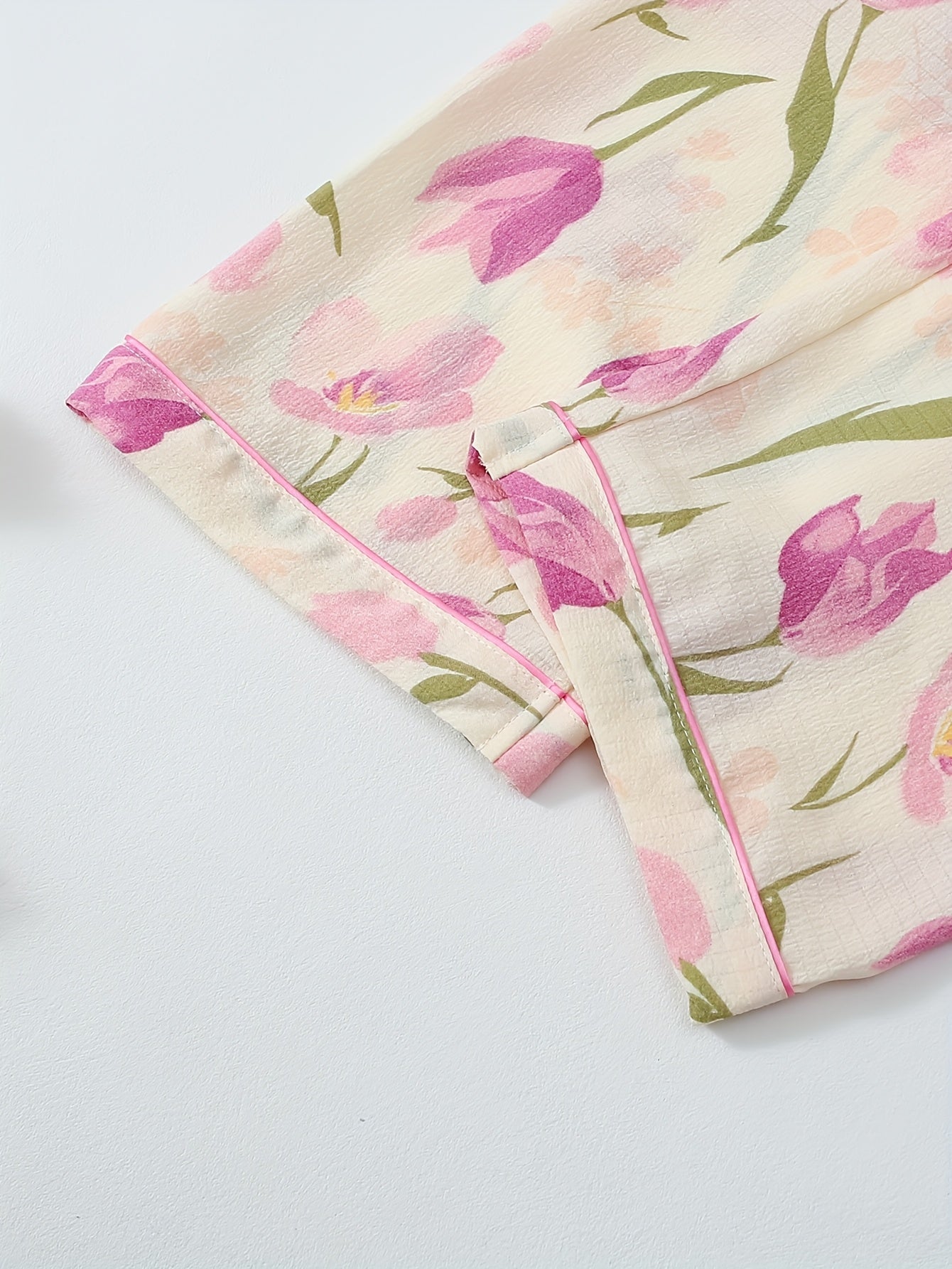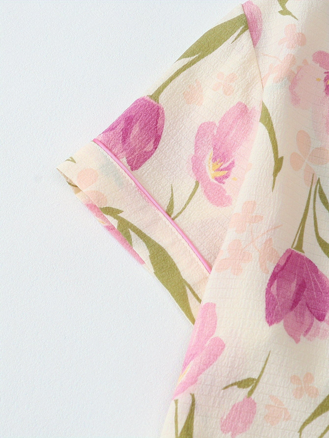 [Women's Red Tulip Pajama Set] Two-Piece Women's Red Tulip Flower Print Pajama Set, Short Sleeve Button- Shirt and Bow Tie Pants for Spring Summer Autumn Casual Loungewear